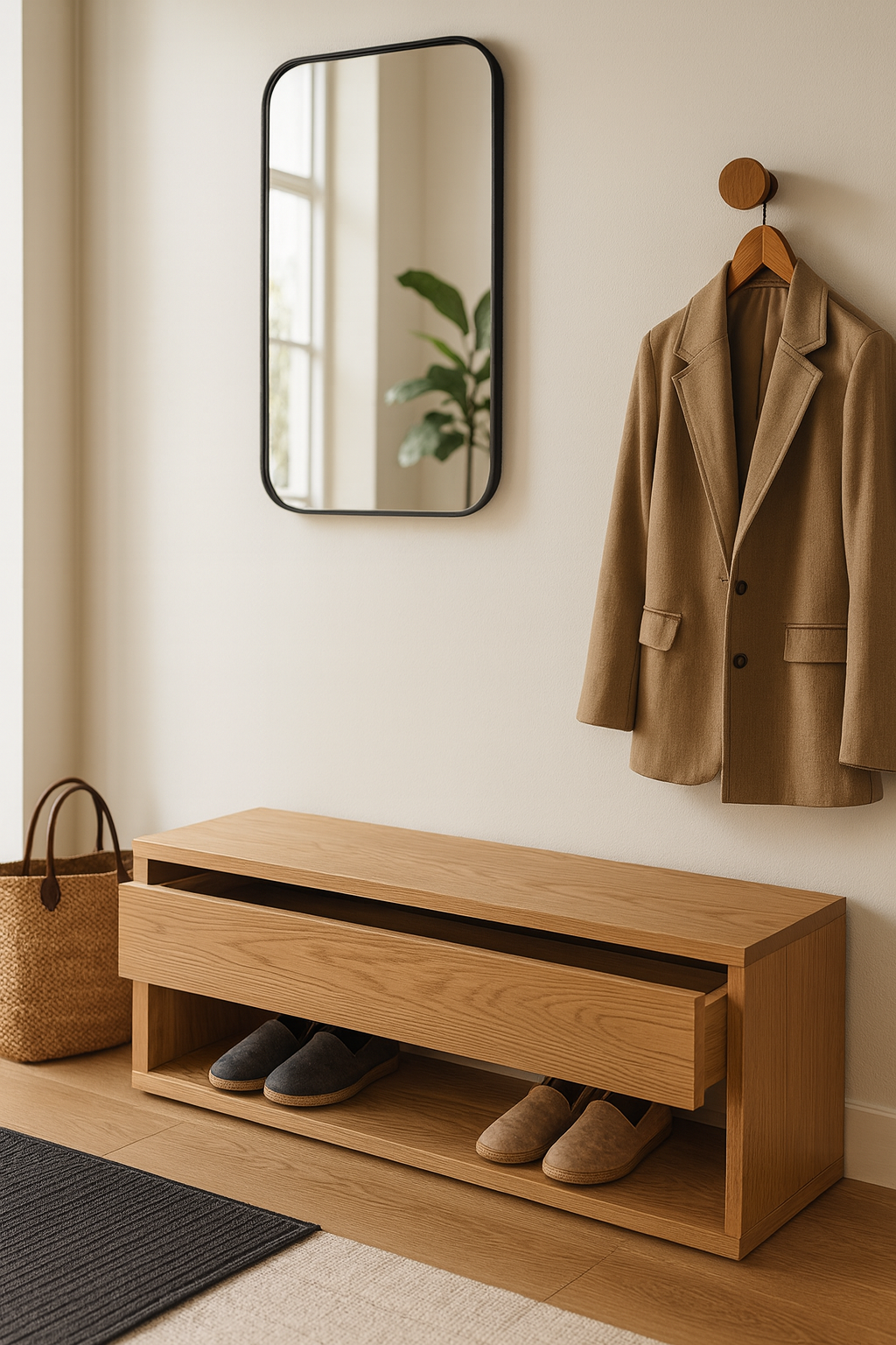 Our brand new handmade storage bench, made with natural oak. This bench is hand crafted and comes 100% Pre-assembled. The bench has a drawer for extra storage as well!